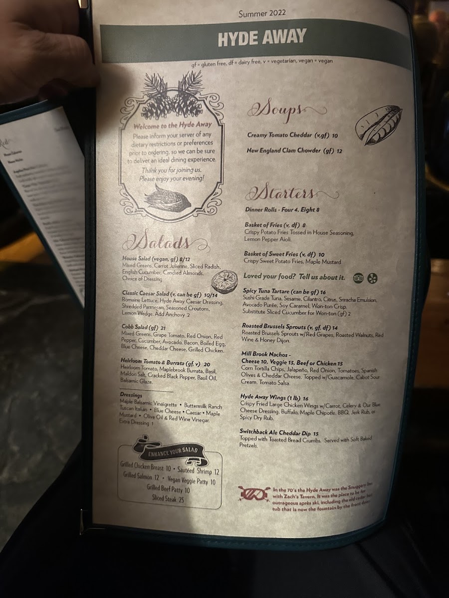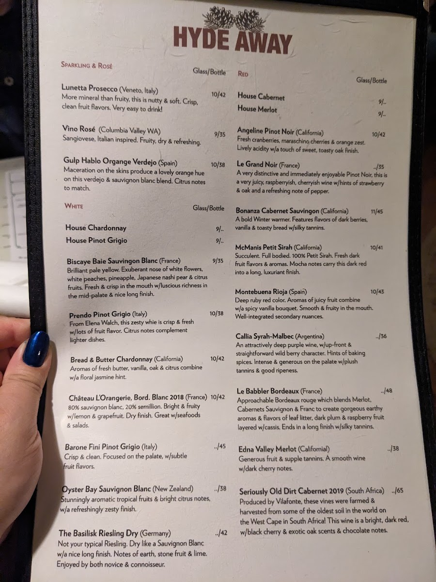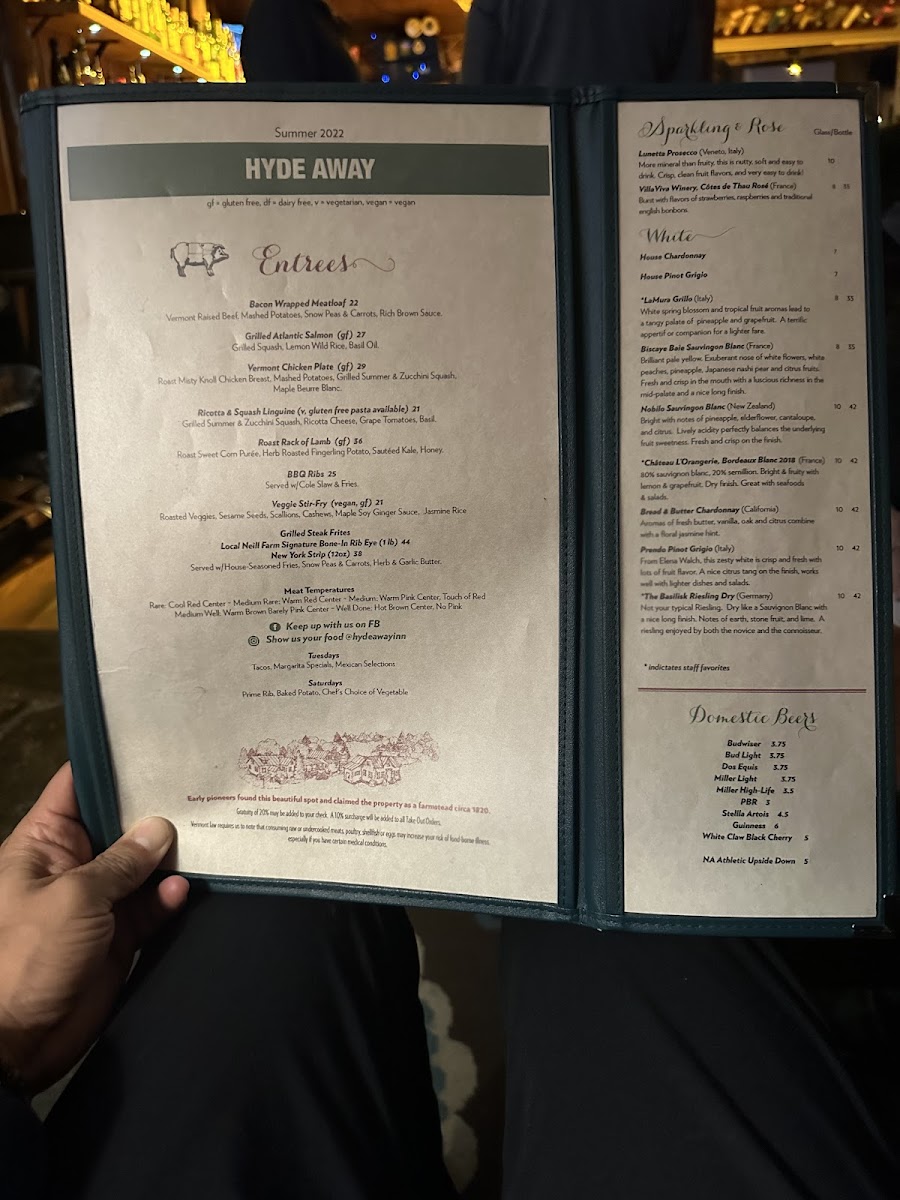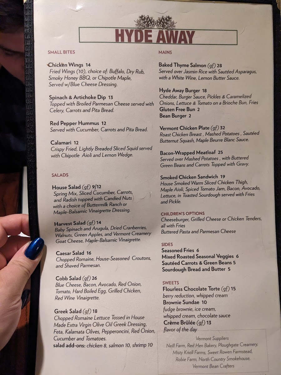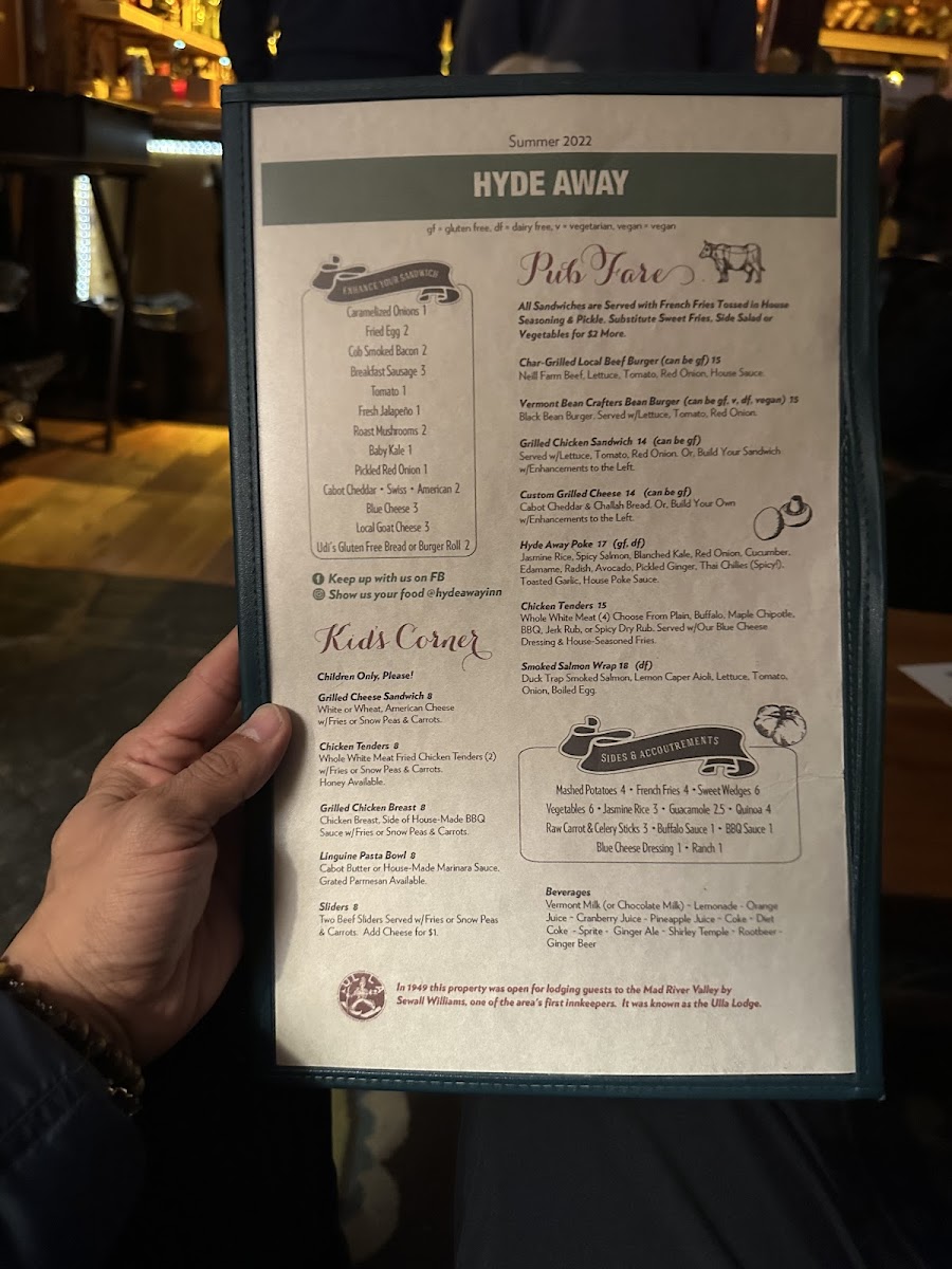 The menu at Hyde Away reflects a comfortable, down-to-earth American dining experience with a focus on hearty, familiar dishes and thoughtful drinks. Whether you're unwinding after a day on the nearby slopes or settling in for a cozy evening by the fire, the food and beverages here offer a satisfying complement to the inn’s warm, inviting atmosphere.